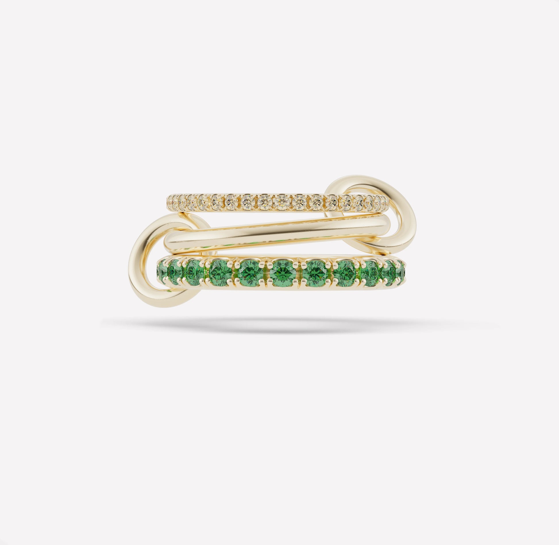 노라 YG 에메랄드 링은 18k 옐로우 골드 소재에 샴페인 다이아몬드와 에메랄드 파베 세팅된 두 개의 밴드와 민자 밴드로 구성되어 있습니다. 여러 손가락에 나눠 착용하거나 한 손가락에 겹쳐 착용하기에 완벽한 링입니다.