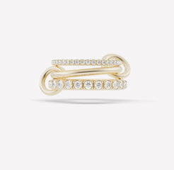 노라 링은 18k 옐로우 골드 소재에 다이아몬드 파베 세팅된 두 개의 밴드와 솔리드 밴드로 구성되어 있습니다. 노라 링은 겹쳐 착용하거나 여러 손가락에 나눠 착용하기에 완벽합니다.