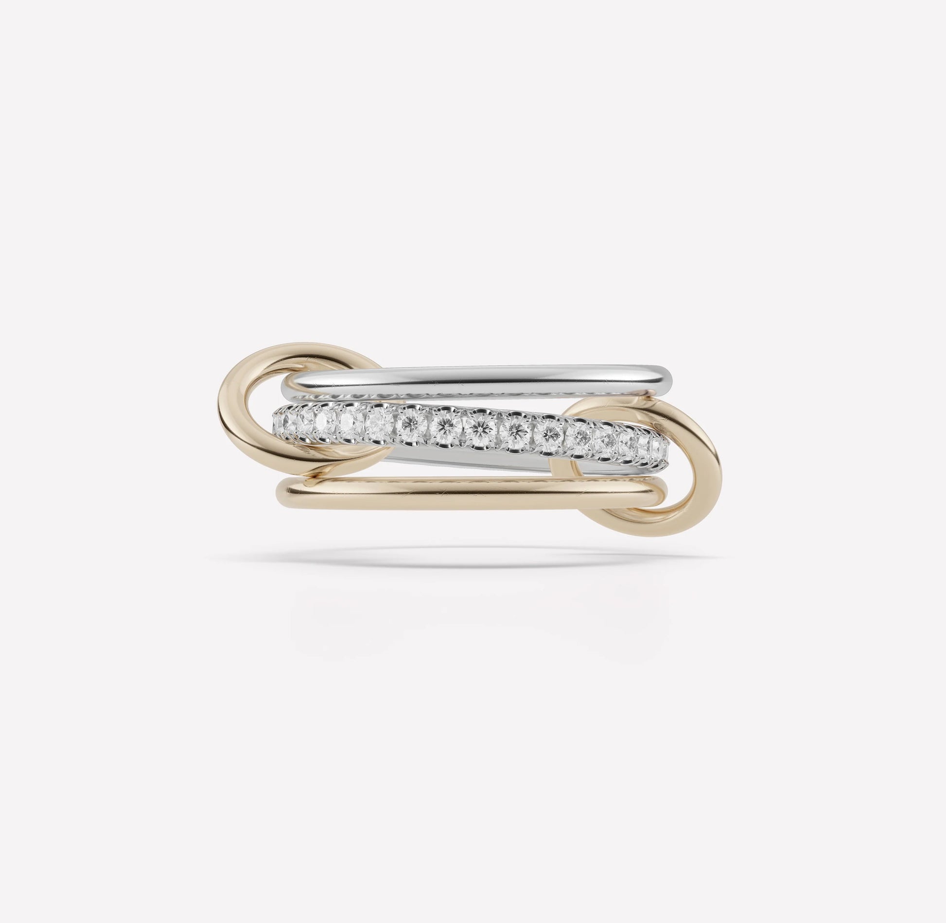 티그리스는 유파베 셋팅 다이아몬드가 셋팅된 중앙 밴드를 포인트로 제작되었으며, .925 스털링 실버 또는 18K 옐로우 골드로 구성된 두 개의 동일 게이지 밴드로 둘러싸여 있습니다. 모든 밴드는 18k 골드 커넥터로 연결되어 모든 앙상블에 우아하고 가벼운 느낌을 제공합니다.